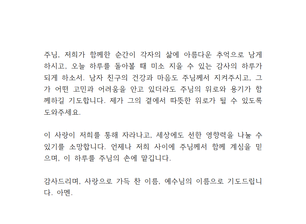 주님, 저희가 함께한 순간이 각자의 삶에 아름다운 추억으로 남게 하시고, 오늘 하루를 돌아볼 때 미소 지을 수 있는 감사의 하루가 되게 하소서. 남자 친구의 건강과 마음도 주님께서 지켜주시고, 그가 어떤 고민과 어려움을 안고 있더라도 주님의 위로와 용기가 함께하길 기도합니다. 제가 그의 곁에서 따뜻한 위로가 될 수 있도록 도와주세요.