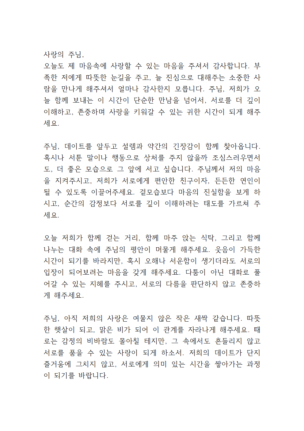 이번 기도문은 사랑하는 남자 친구와의 데이트를 앞두고 마음을 다해 드리는 기도문 내용입니다.