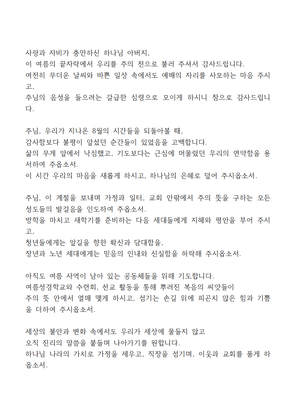 하나님 아버지, 이 예배를 통해 저희가 서로 사랑하며 하나 되는 공동체로 세워지게 하시고, 세상 속에서 주님의 사랑과 복음을 전하는 빛과 소금의 역할을 감당하게 하옵소서. 우리의 가정과 교회, 이 나라와 민족 위에 주님의 은혜와 평강이 충만하게 하시고, 저희가 속한 모든 자리에서 주님의 영광을 드러내는 삶을 살게 하옵소서.