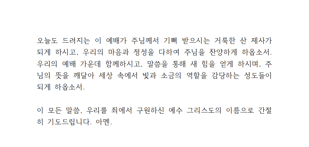 오늘도 드려지는 이 예배가 주님께서 기뻐 받으시는 거룩한 산 제사가 되게 하시고, 우리의 마음과 정성을 다하여 주님을 찬양하게 하옵소서. 우리의 예배 가운데 함께하시고, 말씀을 통해 새 힘을 얻게 하시며, 주님의 뜻을 깨달아 세상 속에서 빛과 소금의 역할을 감당하는 성도들이 되게 하옵소서.