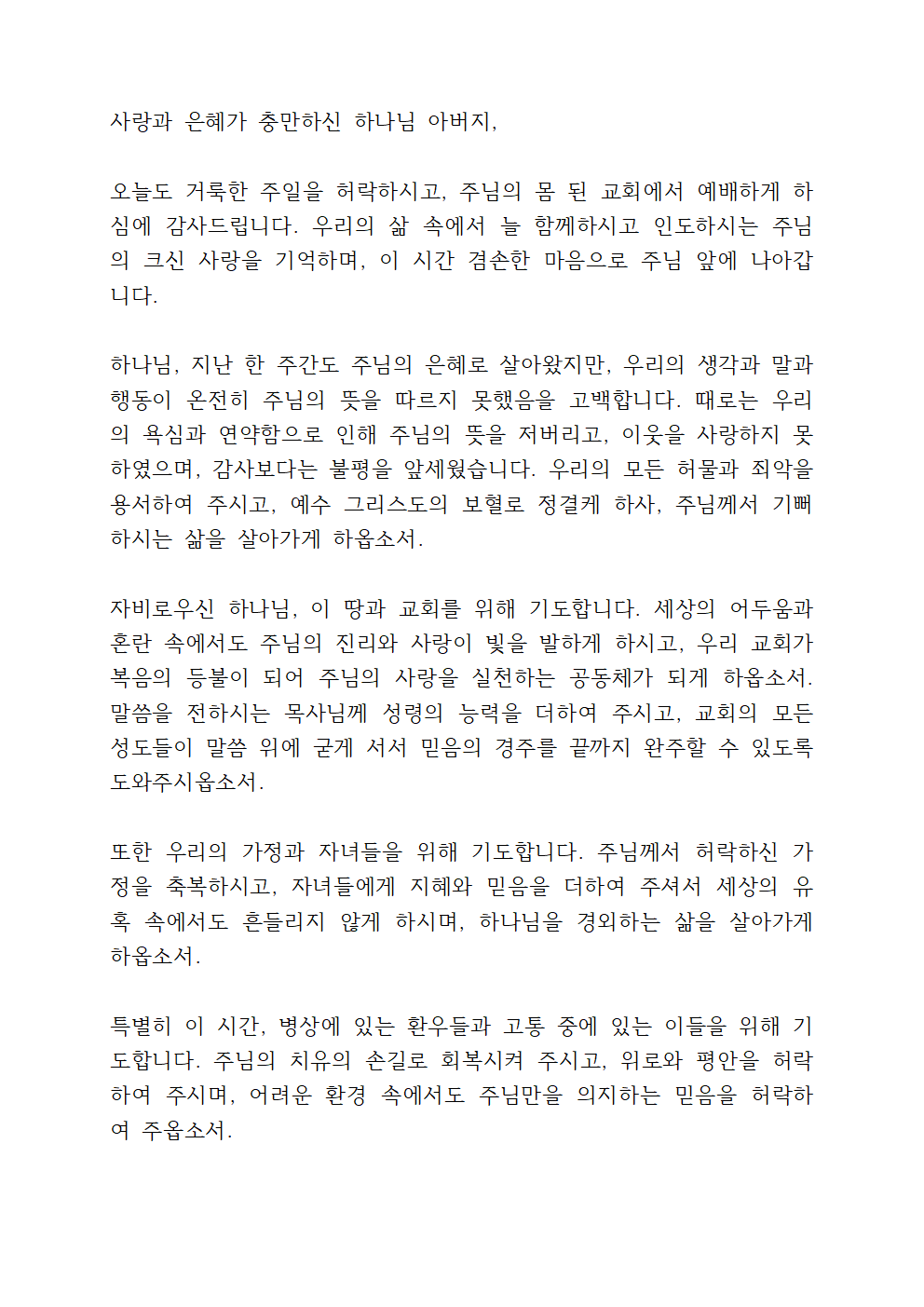 자비로우신 하나님, 이 땅과 교회를 위해 기도합니다. 세상의 어두움과 혼란 속에서도 주님의 진리와 사랑이 빛을 발하게 하시고, 우리 교회가 복음의 등불이 되어 주님의 사랑을 실천하는 공동체가 되게 하옵소서. 말씀을 전하시는 목사님께 성령의 능력을 더하여 주시고, 교회의 모든 성도들이 말씀 위에 굳게 서서 믿음의 경주를 끝까지 완주할 수 있도록 도와주시옵소서.