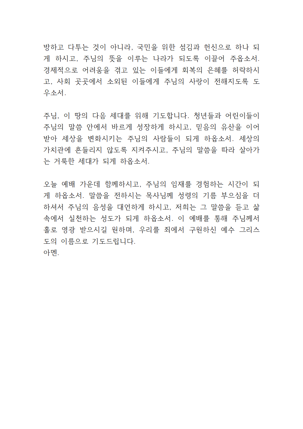하나님 아버지, 이 나라 대한민국을 위하여 기도합니다. 주님께서 친히 통치하셔서 정의와 공의가 강물처럼 흐르게 하옵소서. 정치 지도자들에게 지혜를 주시고, 국민을 위한 바른 정책을 펼치게 하옵소서. 서로를 비방하고 다투는 것이 아니라, 국민을 위한 섬김과 헌신으로 하나 되게 하시고, 주님의 뜻을 이루는 나라가 되도록 이끌어 주옵소서. 경제적으로 어려움을 겪고 있는 이들에게 회복의 은혜를 허락하시고, 사회 곳곳에서 소외된 이들에게 주님의 사랑이 전해지도록 도우소서.