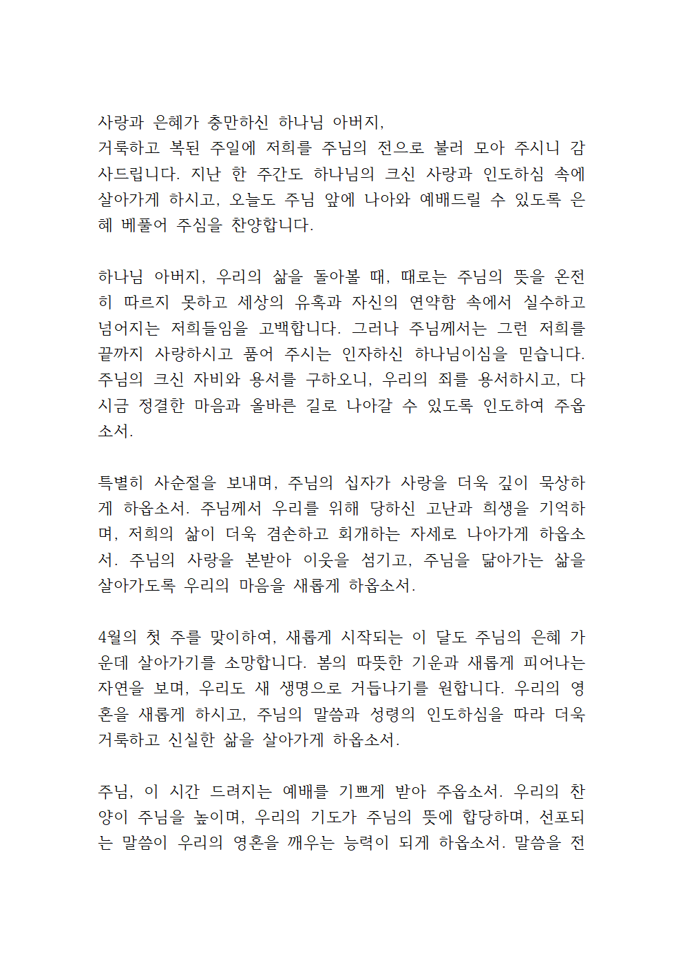 4월 첫째 주일낮예배 기도문