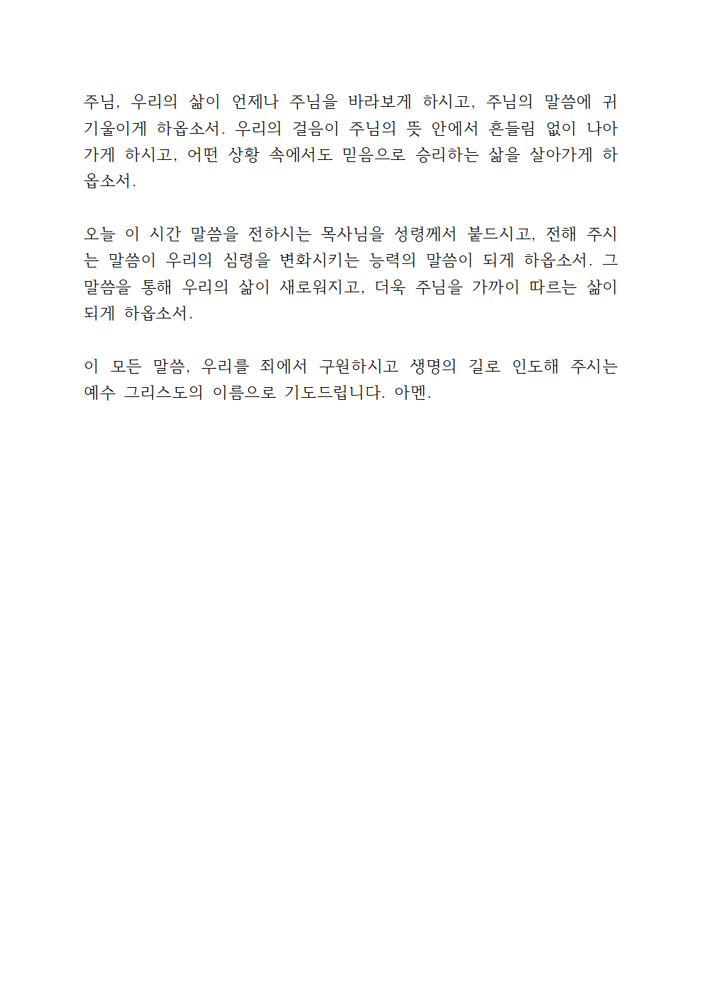 말씀을 전하시는 목사님을 특별히 주님 손에 맡겨드립니다. 목사님의 영육 간의 강건함을 지켜 주시고, 성령의 기름 부으심으로 충만케 하셔서 주님의 뜻과 사랑을 담대히 전하게 하옵소서. 목사님의 입술을 통해 전해지는 말씀이 듣는 모든 이의 심령에 깊이 새겨지게 하시고, 그 말씀을 통해 우리가 삶 속에서 순종하고 실천하는 믿음의 결단을 하게 하옵소서.