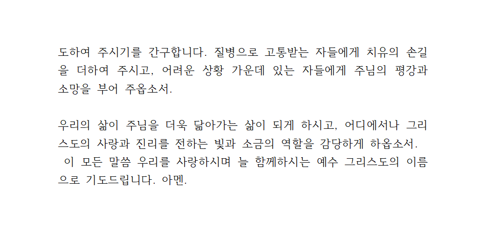 우리의 삶이 주님을 더욱 닮아가는 삶이 되게 하시고, 어디에서나 그리스도의 사랑과 진리를 전하는 빛과 소금의 역할을 감당하게 하옵소서. 이 모든 말씀 우리를 사랑하시며 늘 함께하시는 예수 그리스도의 이름으로 기도드립니다. 아멘.
