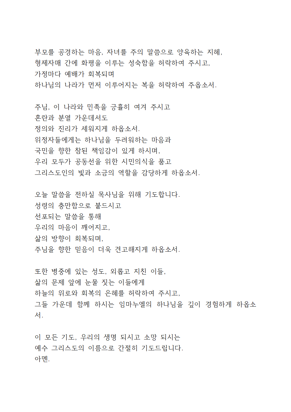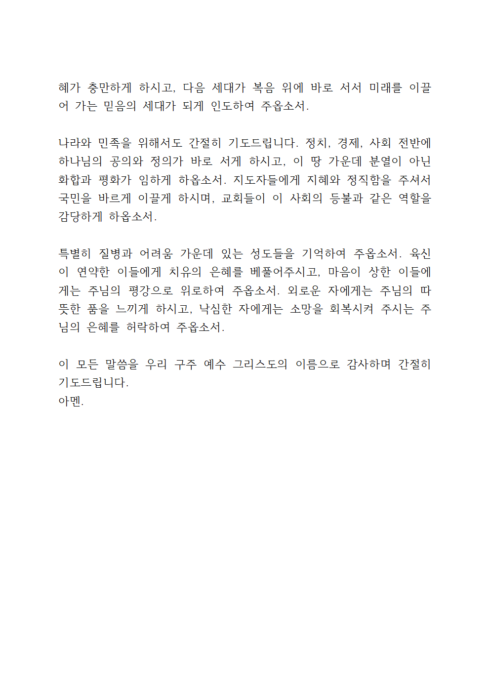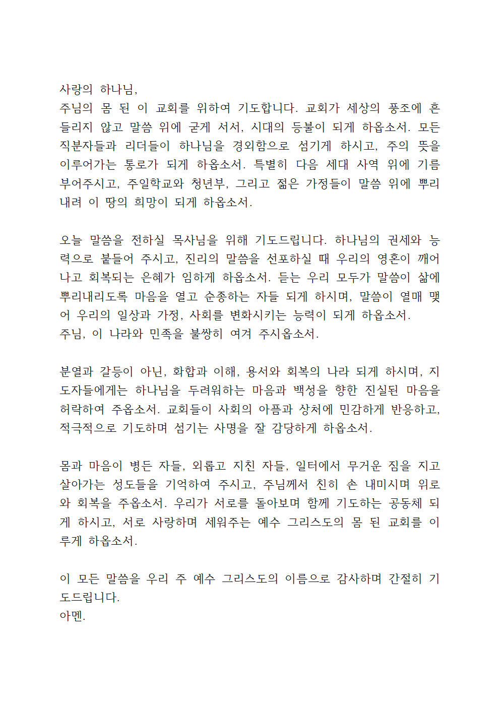 주님, 병상에 있는 이들, 경제적 어려움으로 눈물 짓는 이들, 마음의 상처로 고통 받는 이들, 외로움과 상실 속에 지친 모든 지체들을 기억하여 주옵소서. 주님의 위로와 평강으로 함께하여 주시고, 그들이 다시 주님의 손을 붙잡고 일어설 수 있도록 은혜를 베풀어 주시옵소서. 주님, 오늘 우리가 드리는 이 예배를 통해 다시 한번 주님의 음성을 듣게 하시고, 주님의 뜻을 깨닫게 하시며, 믿음으로 세상을 살아갈 힘을 얻게 하옵소서.