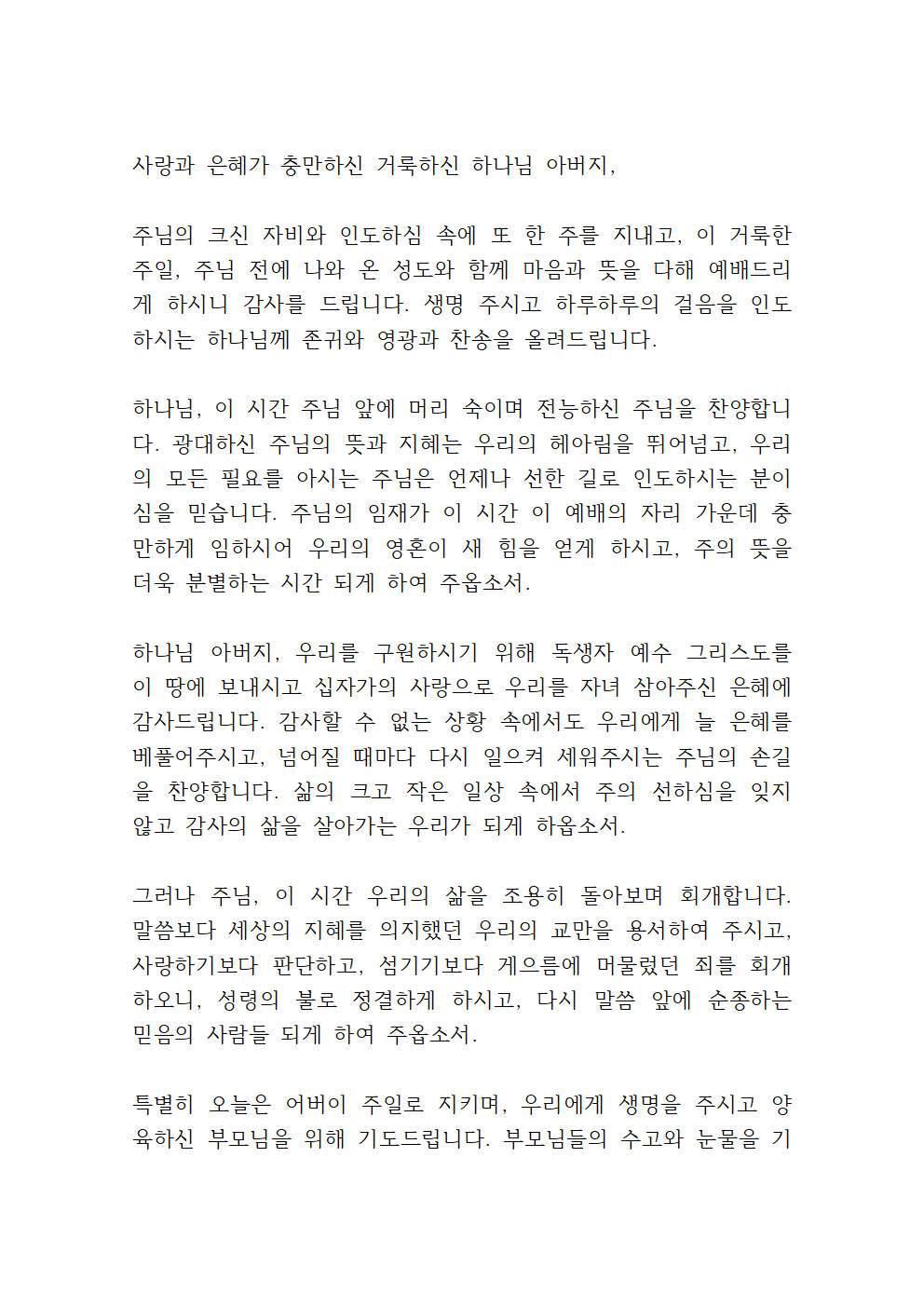 특별히 오늘은 어버이 주일로 지키며, 우리에게 생명을 주시고 양육하신 부모님을 위해 기도드립니다. 부모님들의 수고와 눈물을 기억하게 하시고, 그들의 기도와 헌신이 헛되지 않도록 자녀된 우리가 그 사랑에 보답하는 삶 살게 하옵소서. 연로하신 어르신들의 건강을 지켜주시고, 남은 생애가 존귀하고 평안하게 하시며, 주님 안에서 기쁨과 소망이 넘치는 복된 삶 되게 인도하여 주옵소서. 또한 지금 이 땅의 부모 세대가 믿음으로 다음 세대를 이끄는 참된 본이 되게 하시고, 가정마다 주님의 평안과 사랑이 가득하게 하옵소서.