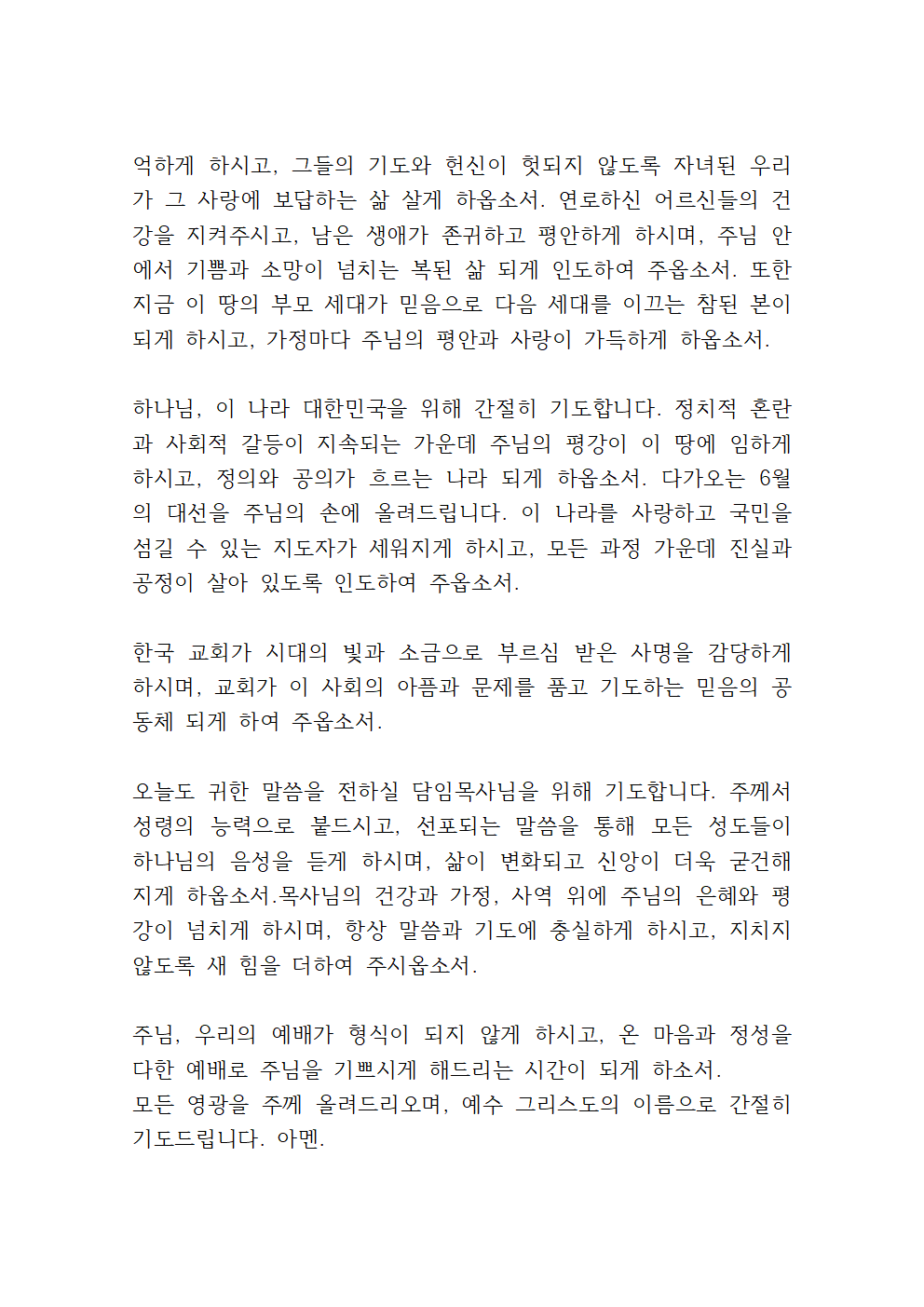 한국 교회가 시대의 빛과 소금으로 부르심 받은 사명을 감당하게 하시며, 교회가 이 사회의 아픔과 문제를 품고 기도하는 믿음의 공동체 되게 하여 주옵소서.