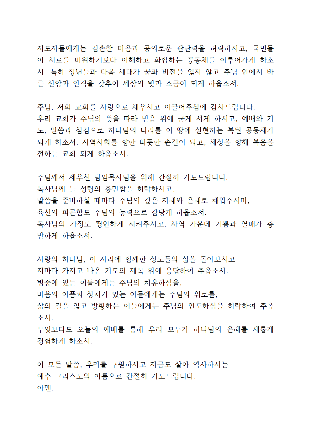 자비로우신 주님, 저희 교회가 지역사회의 등불이 되게 하시고, 세상을 향해 복음의 빛을 전하는 믿음의 공동체가 되게 하옵소서. 모든 성도가 말씀과 기도에 힘쓰며, 삶 속에서 주님의 향기를 드러내는 참된 제자로 살아가게 하시고, 서로를 격려하며 사랑 안에서 하나 되어 하나님 나라를 이루어가는 교회 되게 하옵소서.