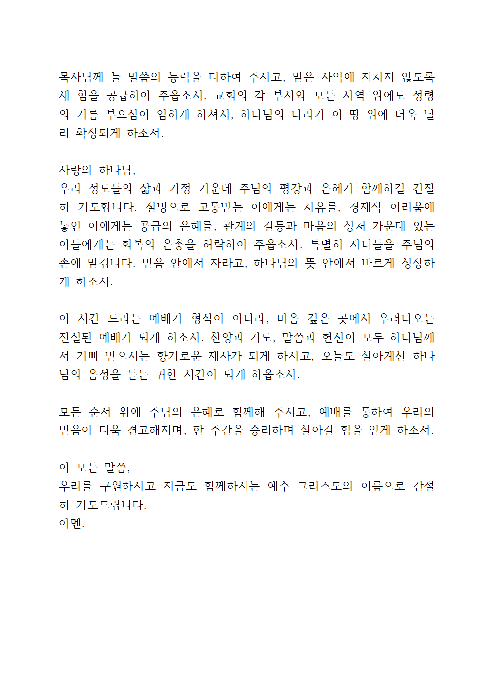 주님, 오늘 이 자리에 나온 성도들 각 사람을 주께서 눈동자처럼 돌보아 주옵소서. 삶의 무게로 지친 이들에게는 위로와 새 힘을, 질병 가운데 있는 이들에게는 치유와 회복을, 앞날을 놓고 고민하는 이들에게는 명확한 인도하심을 허락하여 주옵소서. 무엇보다도 이 예배를 통해 각자의 심령이 새로워지고, 말씀으로 충만해지는 은혜의 시간이 되게 하소서.