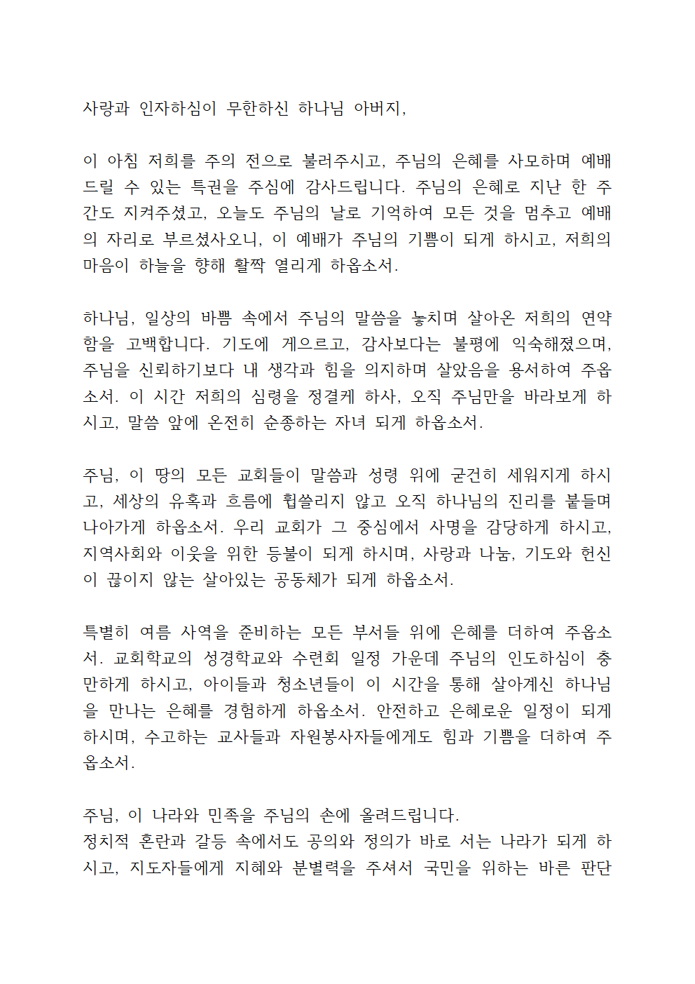 또한 교회 안팎에서 헌신하는 모든 봉사자들을 위해 기도합니다. 주차 봉사, 찬양대, 안내, 주방과 교육 등 보이지 않는 자리에서 수고하는 손길 하나하나를 기억하시고, 하늘의 상급으로 갚아주시길 원합니다. 지치지 않도록 힘과 지혜를 더하시며, 그들의 헌신을 통해 많은 이들이 주님의 사랑을 느끼고 돌아오게 하옵소서.