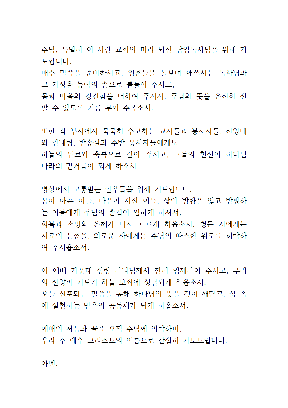 주님, 오늘 드리는 예배가 단지 주일의 형식이 아니라 저희의 진심과 사랑을 담아 드리는 산 제사가 되게 하옵소서. 하나님의 뜻을 묻고, 하나님의 말씀에 귀 기울이며 또 한 주를 주와 동행하는 결단의 시간 되게 하옵소서.